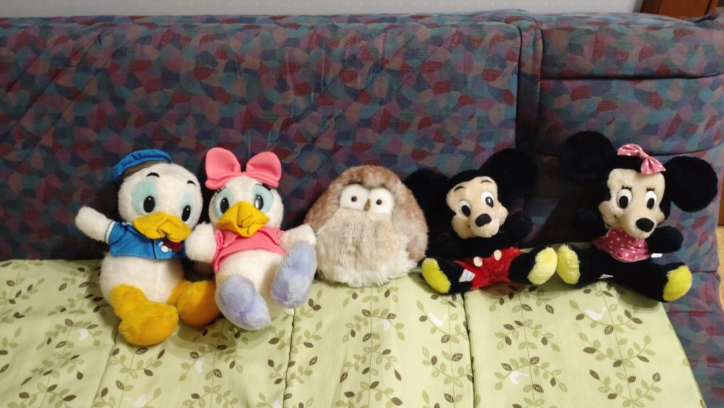 楽譜の棚の上に置いてあるのは初めてディズニーランドに行ったときに買ったもの。洗ったらドナルドダックとデイジーダックの口が変てこになっていましたが、形を整えました。真ん中の「ふくろう」は小樽で義父が買ってくれたものです。綺麗になって気持ち良さそうです。