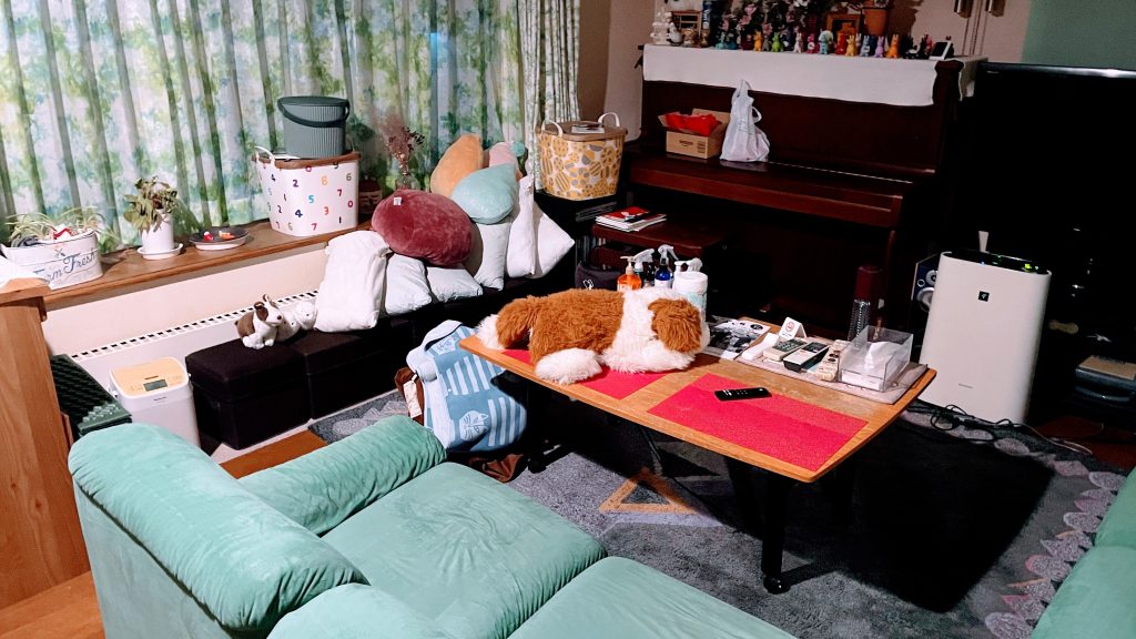 リビングのソファ一式、ソファカバー、クッション、ぬいぐるみなどを洗いました。リビングのソファーは31年前に購入したときはカバーを掛けずに使っていました。しかし、汚れるのるのが怖いので、ソファーカバーなしでは使えません。