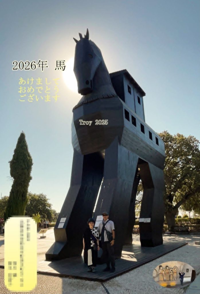 午年ということで、トルコ旅行で訪れたトロイの木馬を年賀状にしました。外人の女性が撮ってげますよよと声をかけくださって撮っていただいたのですが、凄く上手。バックの太陽の光が神秘的。