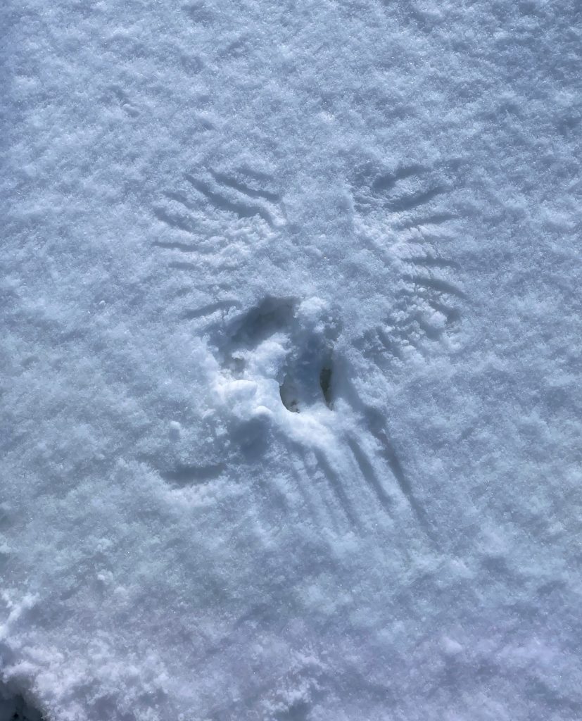 カラスの足跡は時々見るけれど、これは羽を広げて雪の上で遊んだのかな。大きさからして私はヒヨドリではないかと思いましたが。先日もツガイで賑やかに樹の上で鳴いていました。