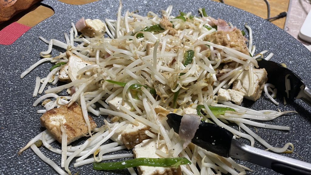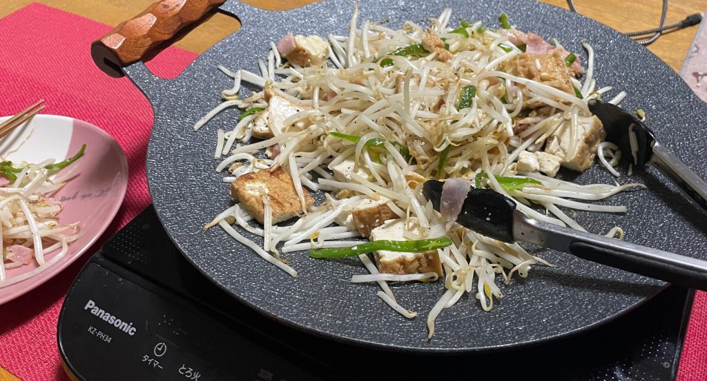 今日はYouTubeを見て作戦を変えた。モヤシ炒め過ぎない。そして、過剰にスパイスをかけ過ぎない。ベーコンを青ネギの代わりにピーマンを加えたところ、モヤシがシャッキシャキ。片栗粉を少し加えるのもポイント。凄く美味しかった!