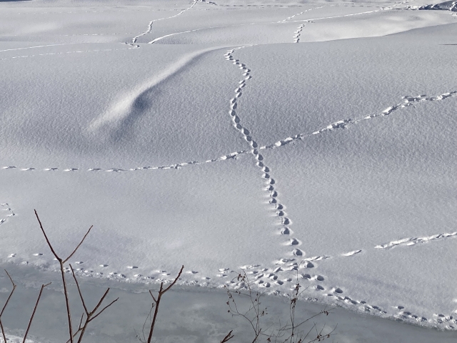 今日もキツネが縦横無尽に歩き回っていました。入り口の方でウサギのフィールドサインもあり、キツネが追いかけているような感じでした。