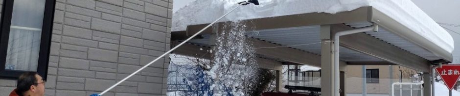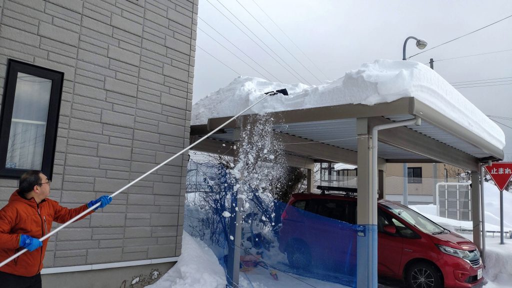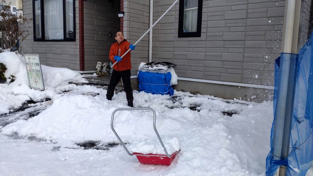 私は玄関前と道路に降り積もった雪を片付けた。はじめさんはカーポートの上に積もった固くなった雪を長い棒を使って雪下ろし。私もやってみたが、なかなか手強い。