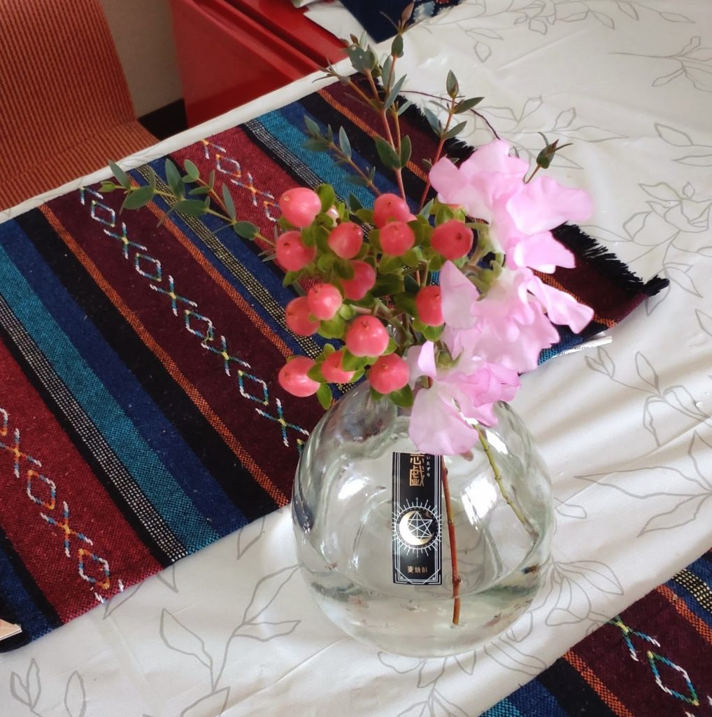 友人から贈られた高級な麦焼酎のボトルに活けてみました。素敵なボトルでご覧のようにお洒落に飾れました。