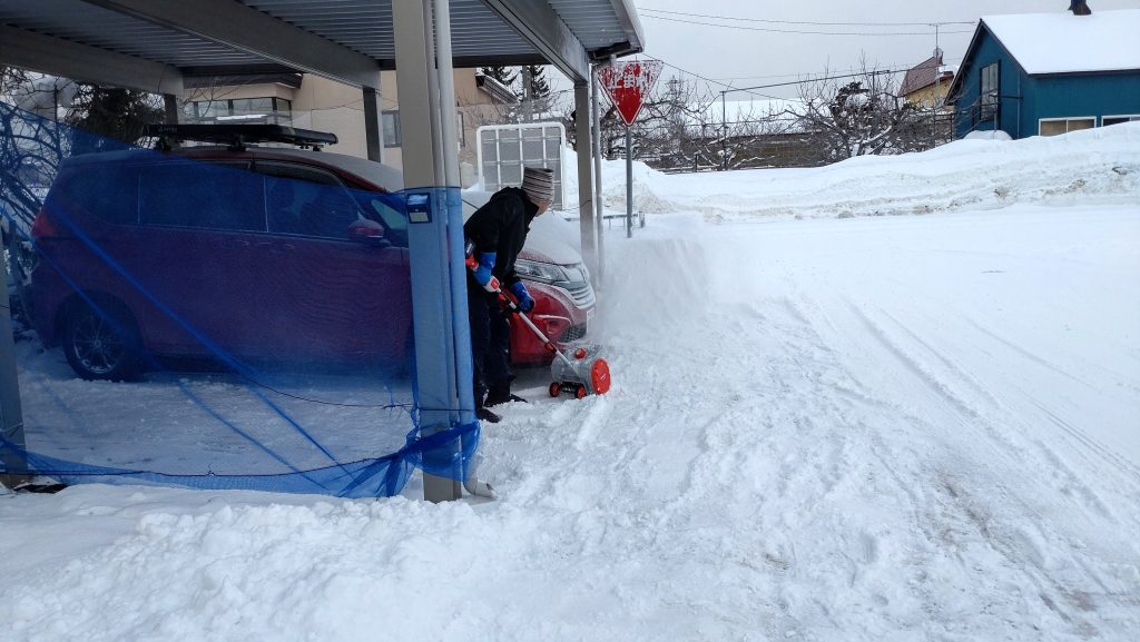 私はスコップで、はじめさんは新しく届いた機械で雪を飛ばしました。それにしても、すぐに手がかじかみ2回家に入って手を温めました。