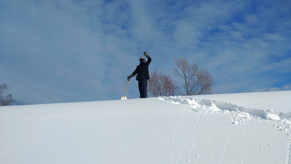 スコップを持って、雪山を駆け上っていった はじめさん。なかなか身軽です。