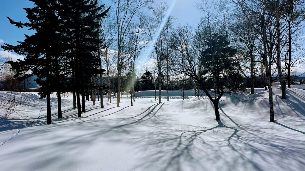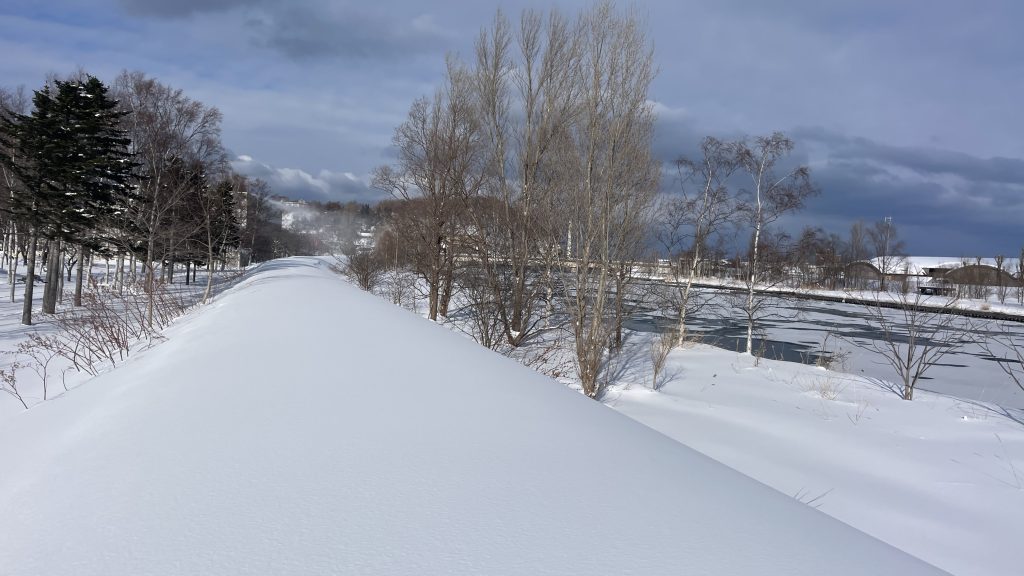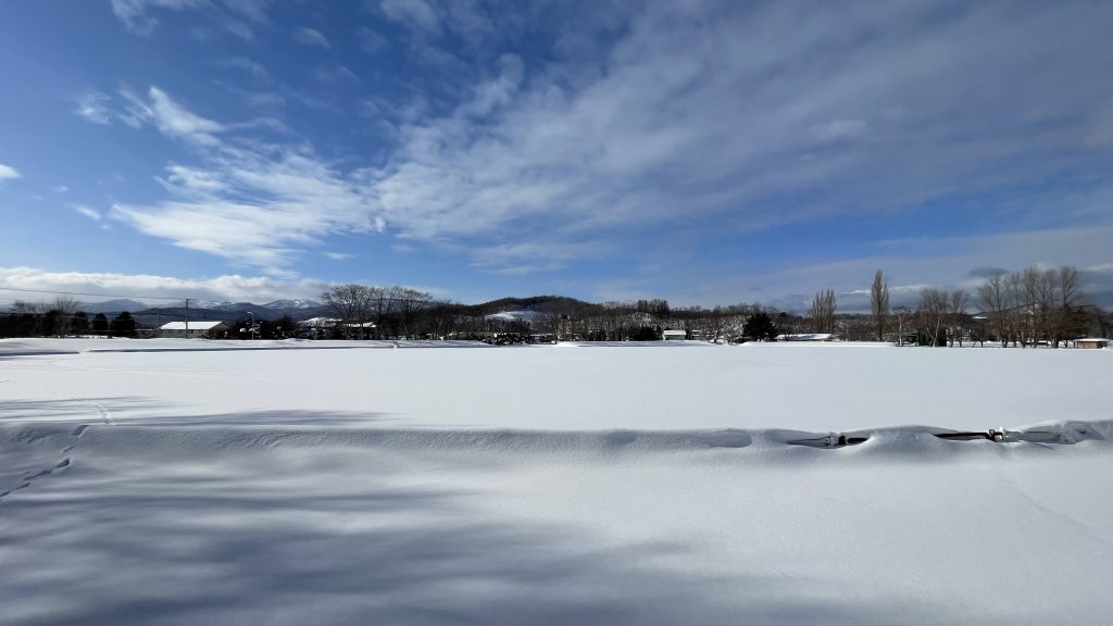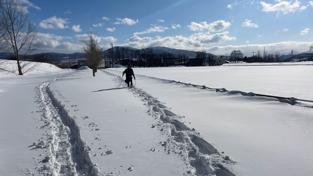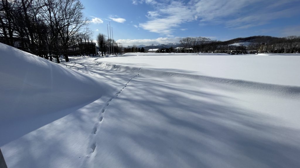 昨日は暴風雪で来ませんでしたが、かなり雪が積もっていました。グランドを歩かず、雪の山の中をスノーシューで歩き回りました。かなり足を上げるので運動量が半端ない。