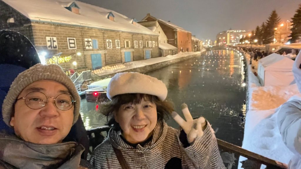 小樽ビール倉庫No.1で小樽ビール倶楽部に参加する前に運河で記念撮影。寒いので、雪あかりりは此処だけ。