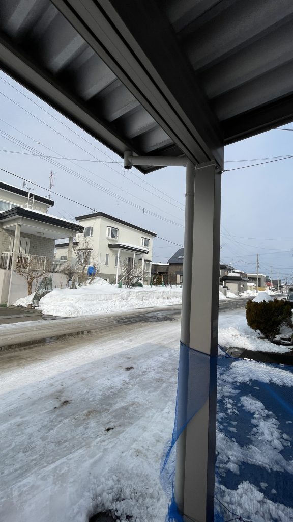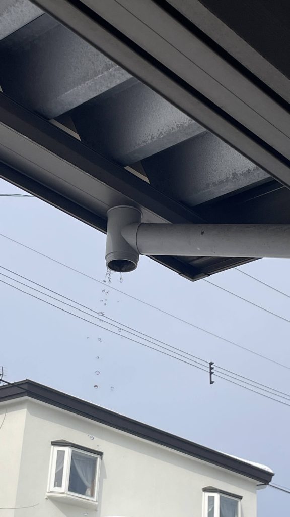 カーポートの上の雪も融けて、下に水が激しく落ちていました。