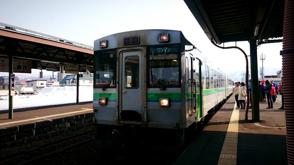 平日のお昼の列車なので空いていると思っいたのですが、甘かった。珍しく2両編成でしたが、ニセコ方面から外人さんが大勢乗っていました。