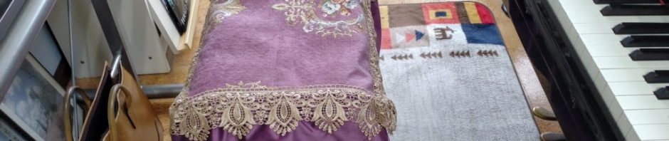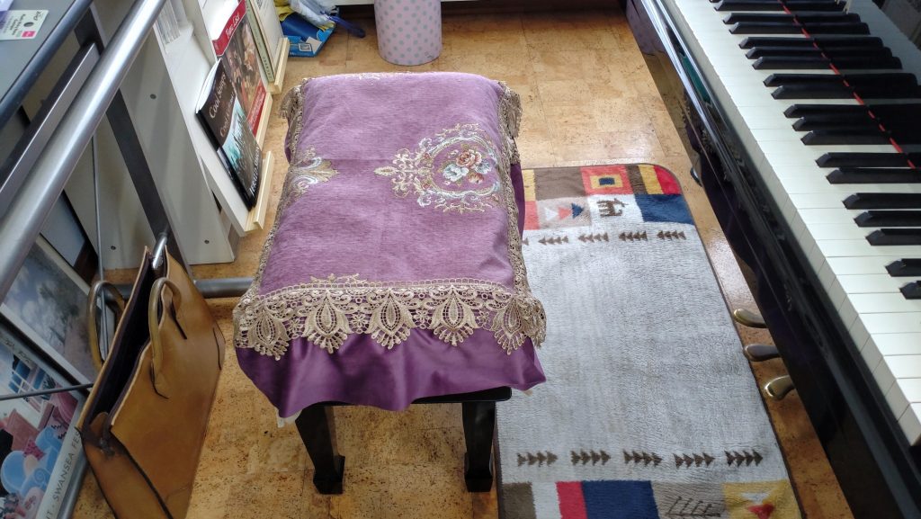 レッスン室へ行くと、いつの間にか奥のヤマハC7用の椅子にローズ系のカバーが掛けられていました。レッスン室の雰囲気からすると壁紙やカーテンがブルーなので、私だったらブルーを選ぶのに、はじめさんは、だからこそローズが良いと思ったようだ。全く相談しないできめてしまうのが、ちょっとなぁ。
