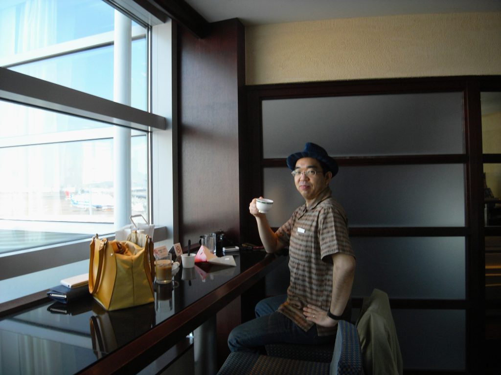 空港で寛ぐ、はじめさん。これから出発なのでワクワクしているところ。