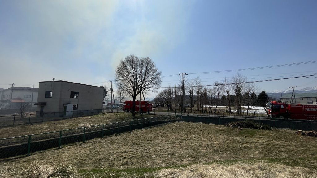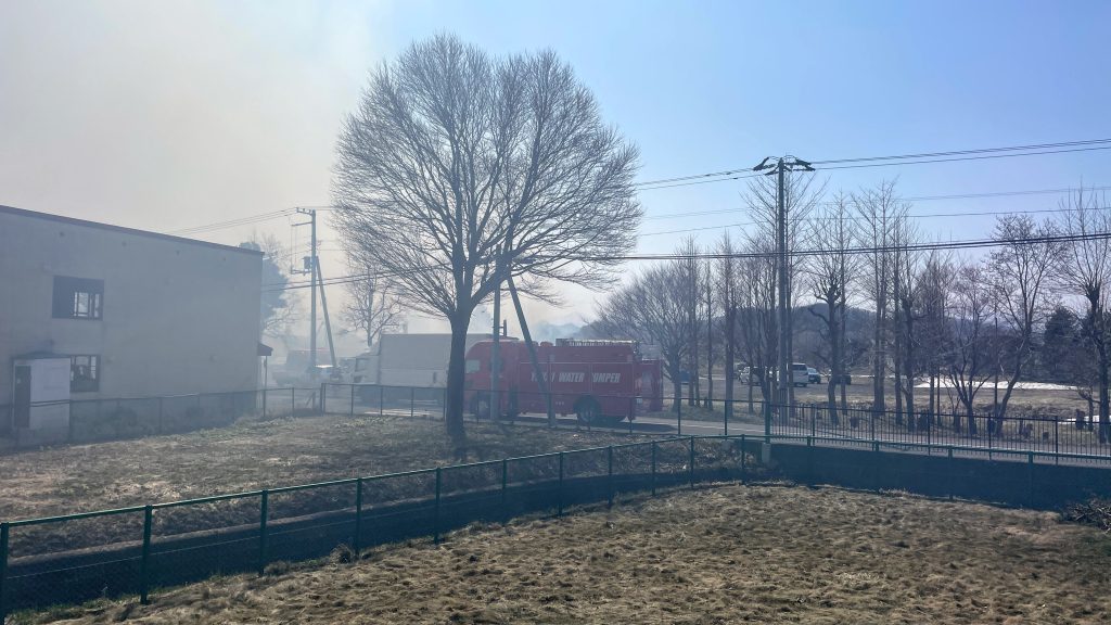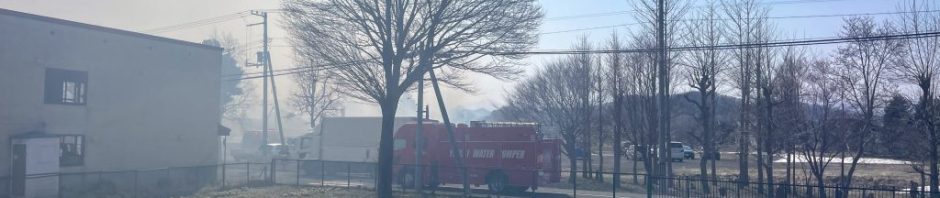 次々と消防車が到着。3台が到着して火消しの作業に入ったようです。帰り道なのですが、コースを変えて帰宅しました。グランドに灰が飛んで来るくらい近かったです。びっくりしました!