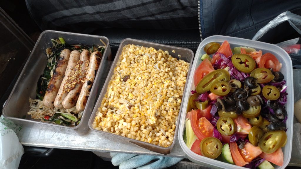 ランチは、お豆腐弁当。それにカラフル野菜サラダ、パラパラチャーハン、そしてソーセージとキノコのグリル。毎週、水曜に炊いたご飯の残りを冷蔵庫で保管してチャーハンにすると、勝手にパラパラのチャーハンができると、はじめさん。確かにお店レベルの美味しさで危険です。