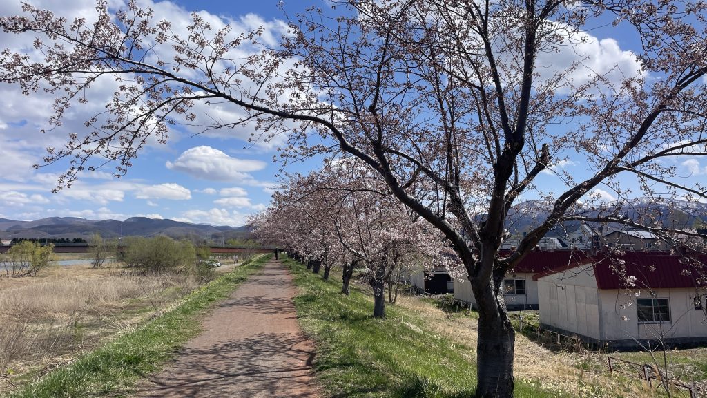青空に白い雲。山にはまだ雪が残っています。桜の季節の余市川ウォーキングは楽しい。
