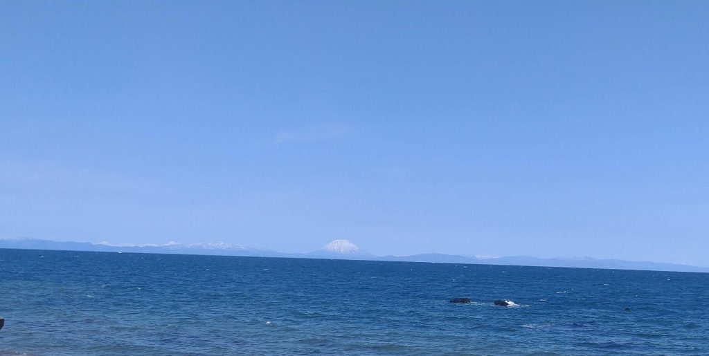 群青の海に要諦山が見えます。あまり睡眠時間を取れませんでしたが、車窓の美しさに大興奮して全く眠りませんでした。お花見の函館ツアーは5年くらい続いていますが、晴れることが多いです。それでも、風は冷たく寒い!