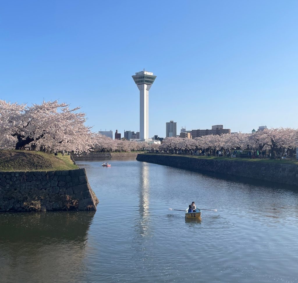 肌寒いですが、歩いているうちに身体が温かくなってきました。五稜郭の桜は満開を通り越して葉っぱが出てきて、風で散り始めていましたが、それはそれで美しい。