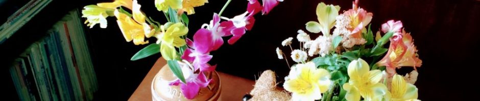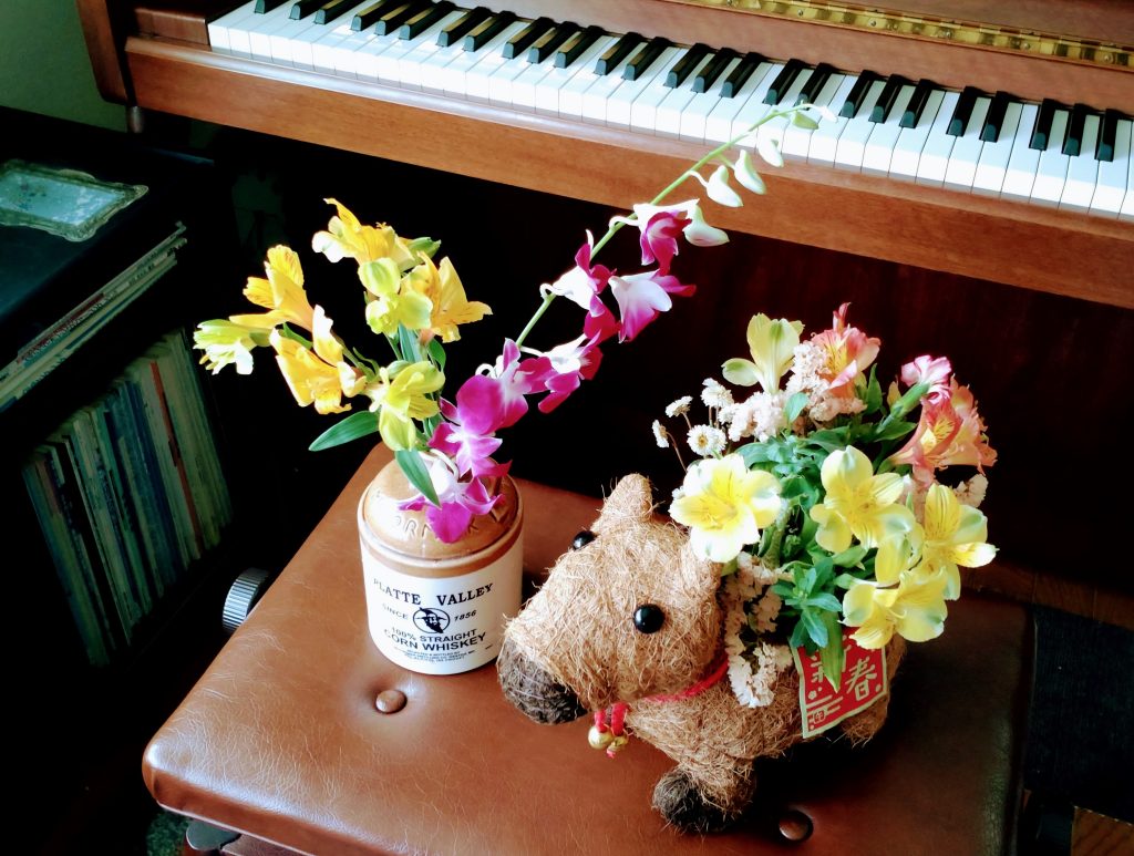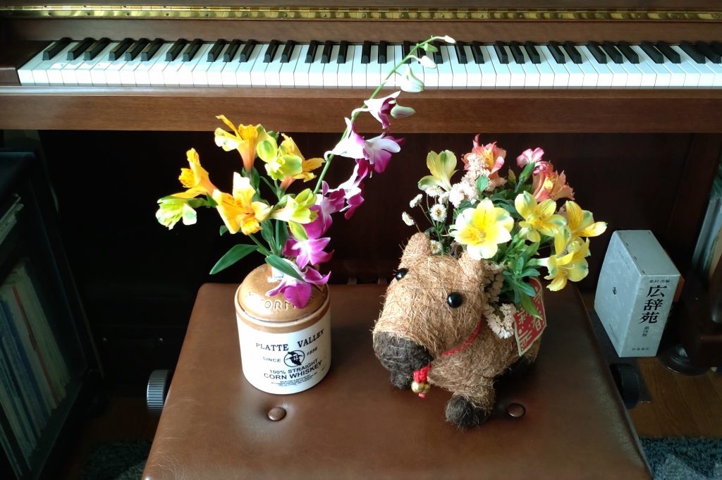コーンお酒が入っていたボトルも可愛いので取っておきました。今日は初めて、このボトルにお花を飾ってみました。