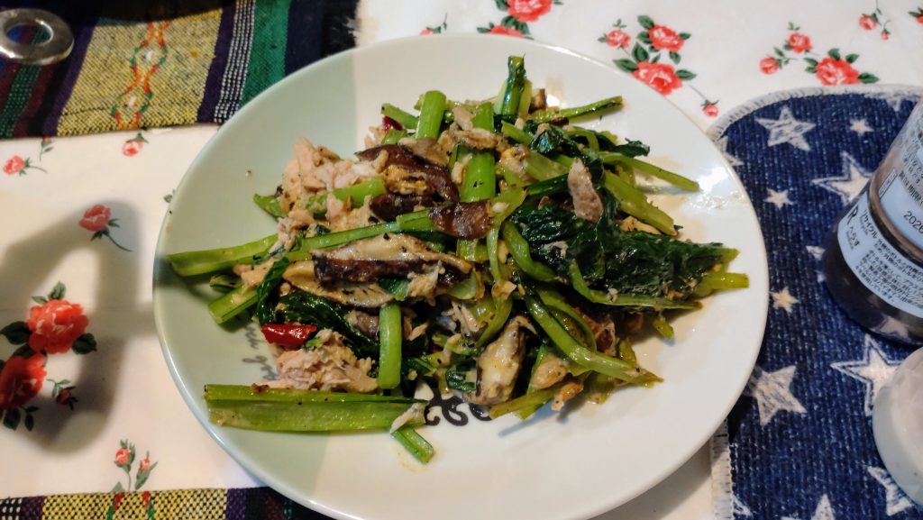 小松菜・シイタケ・シーチキンのマヨネーズ炒めをはじめさんにお願いした。とても美味しい。