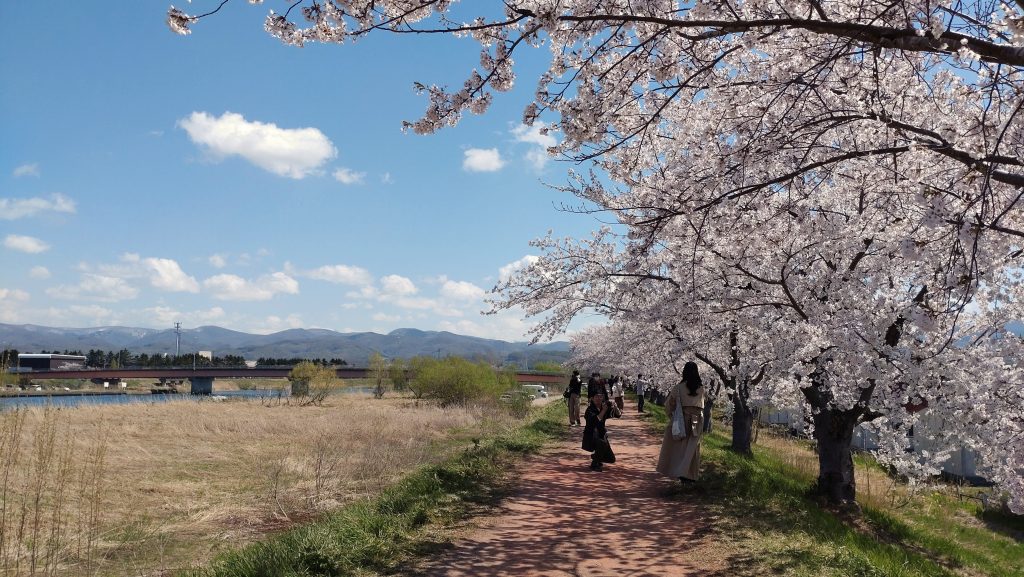 今日は気温も上がり、余市川土手沿いにはお花を楽しむ人々が訪れていました。美しい桜並木の下を歩くのは気持ちが良い。