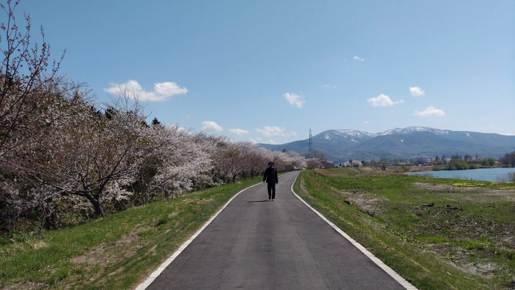 普段は運動公園のグランドをグルグル歩いていますが、桜並木が美しいのでと連日、余市川土手沿いを歩いています。今日は敢えて人が多くいる桜並木を通って、道路を渡り反対側を歩くコースにしました。